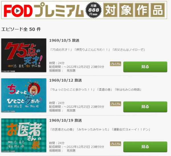 まず、結論から言うと、FODプレミアムでサザエさんの初期(初回)作品動画を無料で視聴できます。