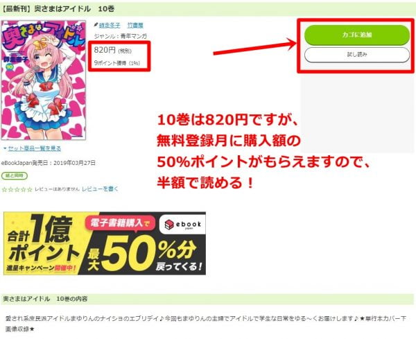 しかし、eBookJapanなら、『奥さまはアイドル』最新刊10巻を含めて全巻を半額とお得に読むことができます。