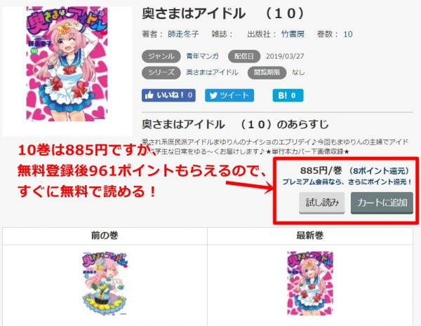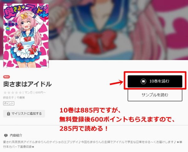 『奥さまはアイドル』最新刊10巻は600ポイントなので、登録時だけのポイントでは無料で読めません。