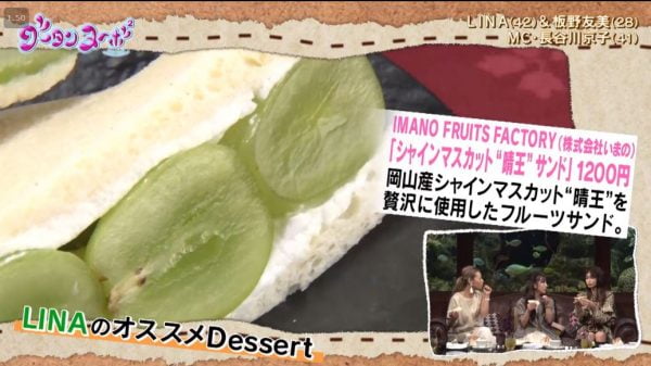 LINAさんオススメのデザートはIMANO FRUITSのシャインマスカット”晴王”サンドです。
