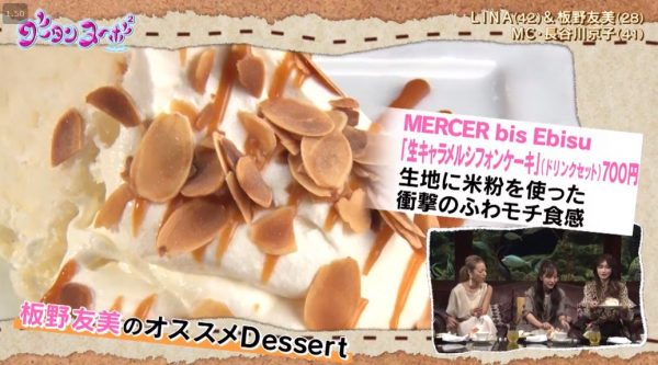 板野友美さんオススメのデザートは恵比寿にあるMERCER bis Ebisu(マーサーズエビス)の生キャラメルシフォンケーキ。