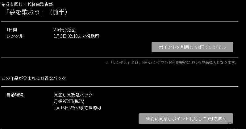 「紅白歌合戦2021年(第72回)」はこちらのように単品購入(1日レンタル)か、見逃し見放題パックがあります。
