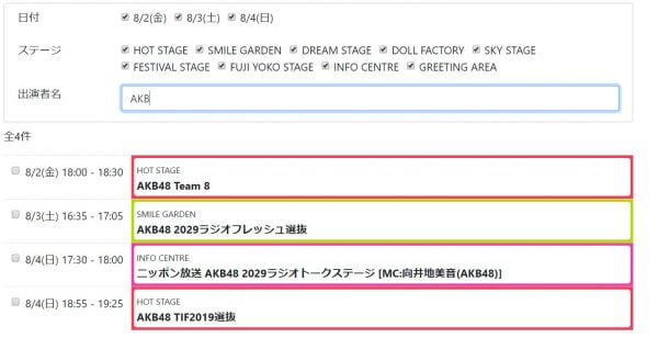 そうすると、こちらの通り、お目当てのアイドルの出演ステージと時間が表示されます。