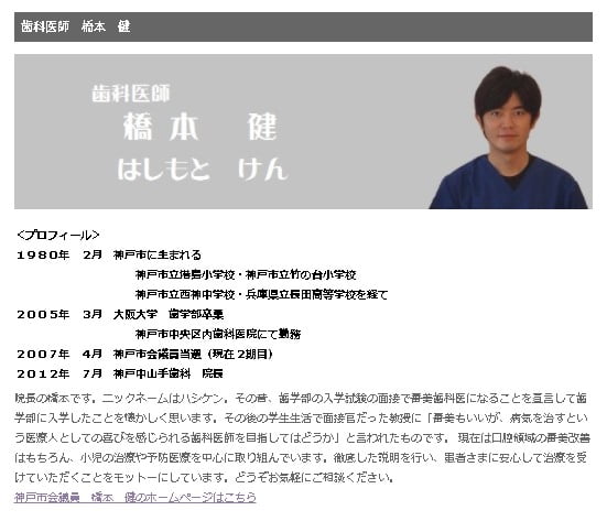 橋本健さんは神戸市議会議員をしながら、歯科医も務めていました。